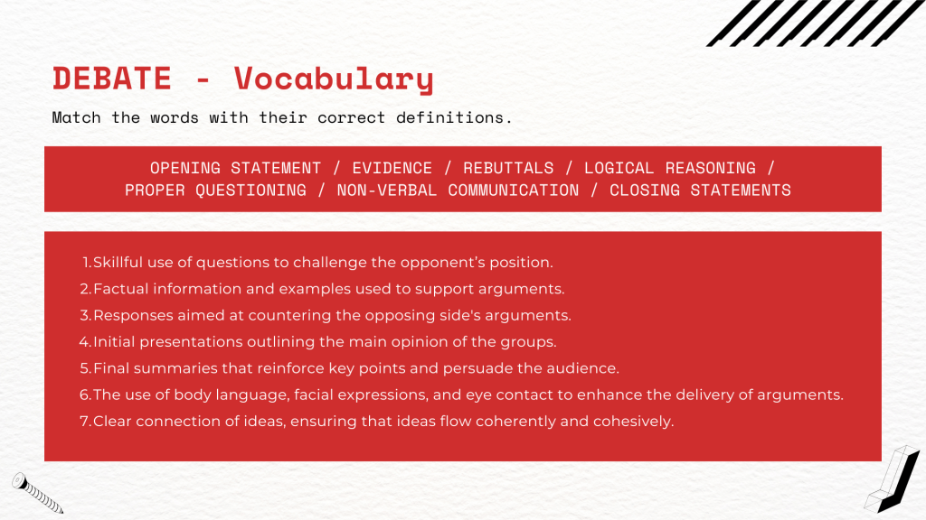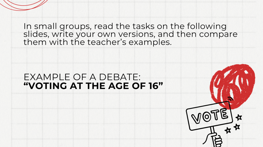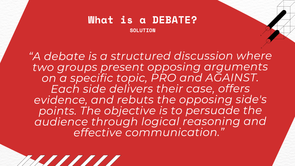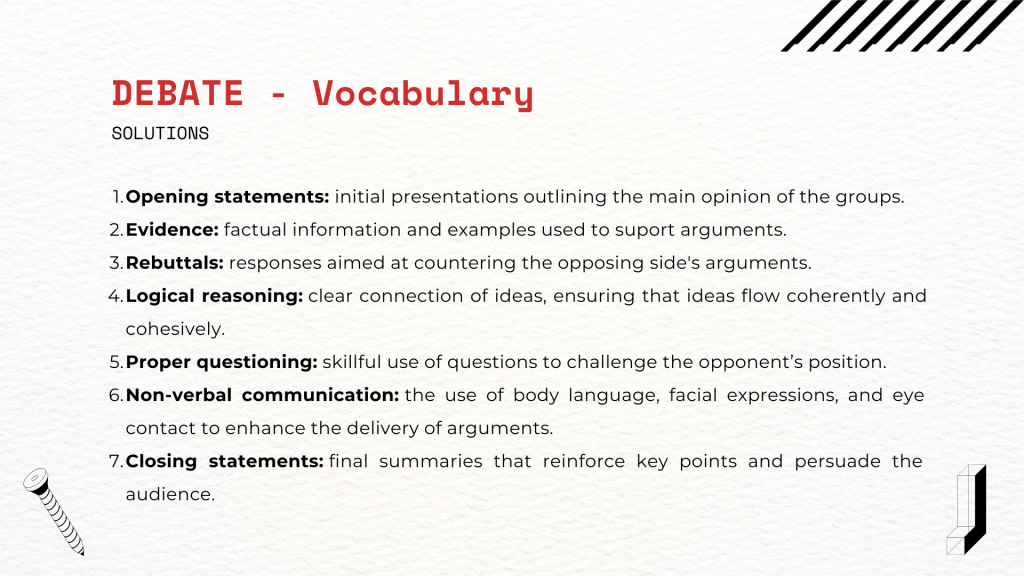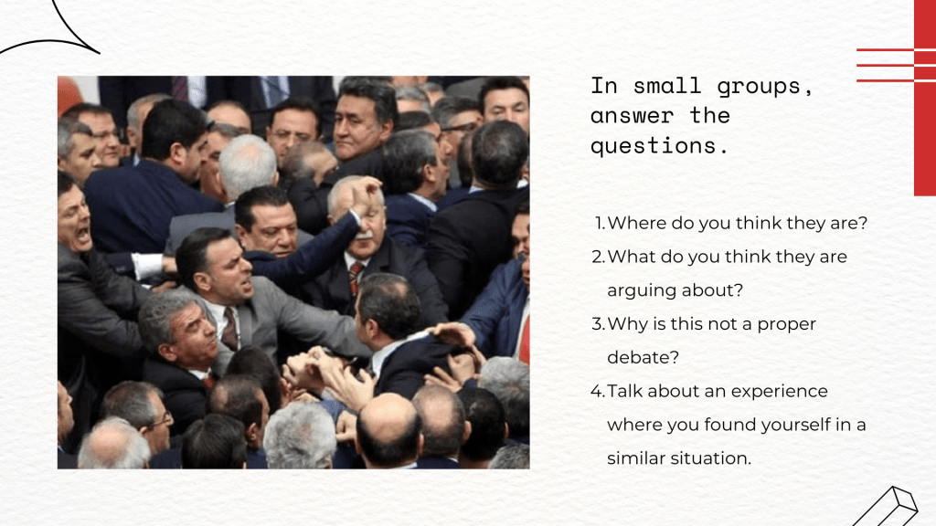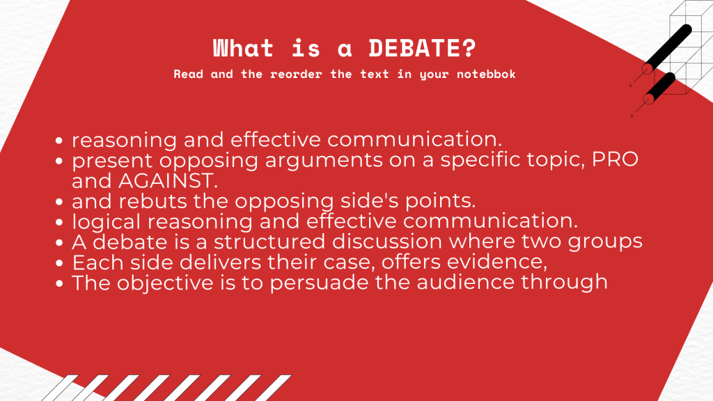 Il dibattito è un’abilità che gli studenti dovranno affinare gradualmente. Poiché non dispongono ancora degli strumenti adeguati, sarà compito dell’insegnante introdurli. Questa è una lezione preparatoria al dibattito vero e proprio.