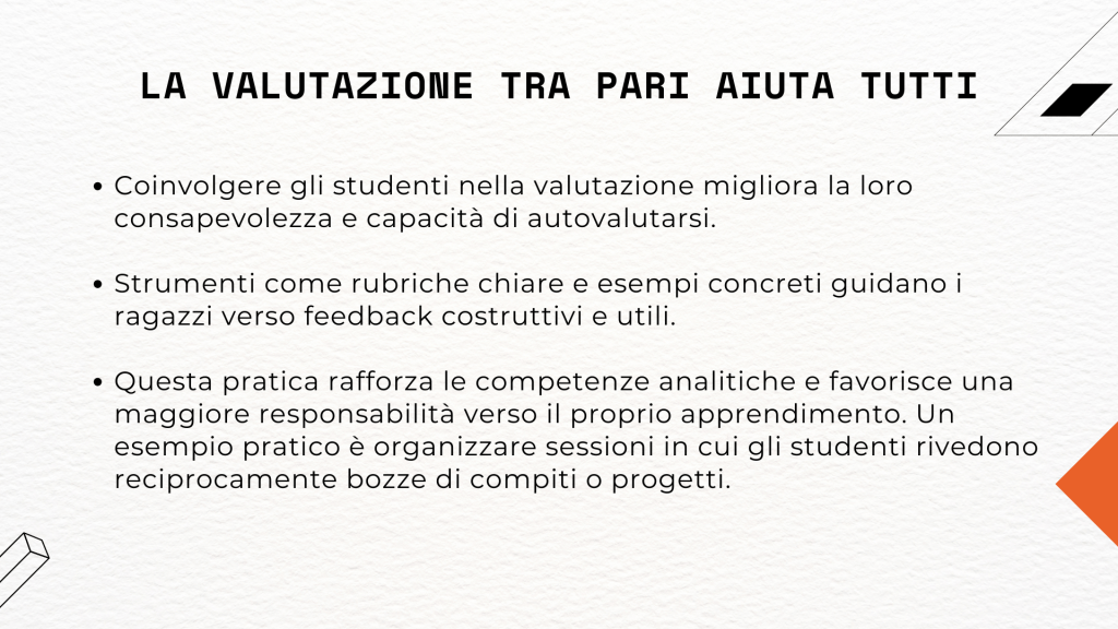 Peer feedback: gli studenti si scambiano i compiti e forniscono feedback ai compagni. Chiedi agli studenti di concentrarsi su cosa è stato fatto bene e su cosa potrebbe essere migliorato. Guidali con delle domande specifiche: “Quali punti ti sono sembrati chiari e ben sviluppati?” o “Cosa pensi che potrebbe essere aggiunto per migliorare?”