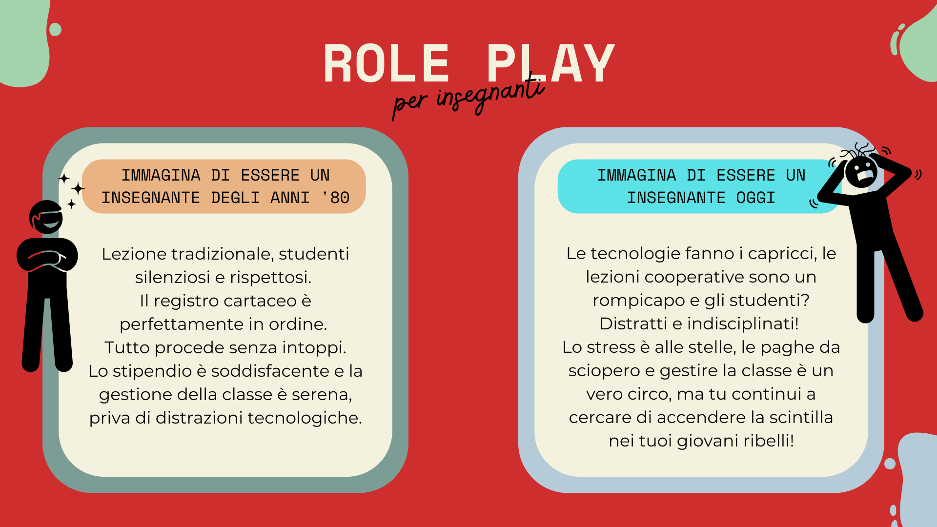A differenza di un Role play tradizionale, il focus qui è sulla riflessione e sulla discussione piuttosto che sull’interpretazione attiva o drammatizzata del ruolo.