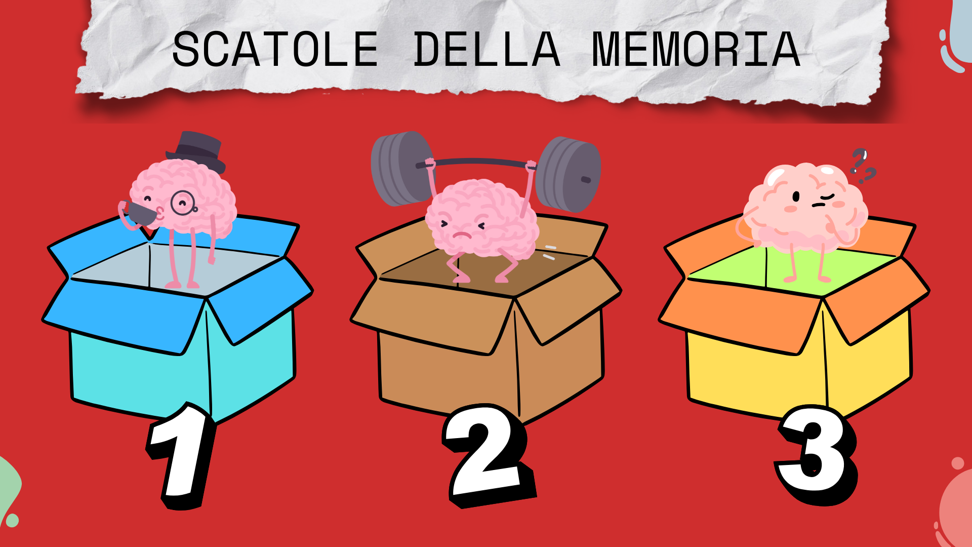 Procurati tre scatole e alcuni bigliettini. Assegna a ciascuna scatola un numero: 1, 2 e 3. La scatola 1 rappresenta la memoria a breve termine, la scatola 2 quella a medio termine e la scatola 3 la memoria a lungo termine.