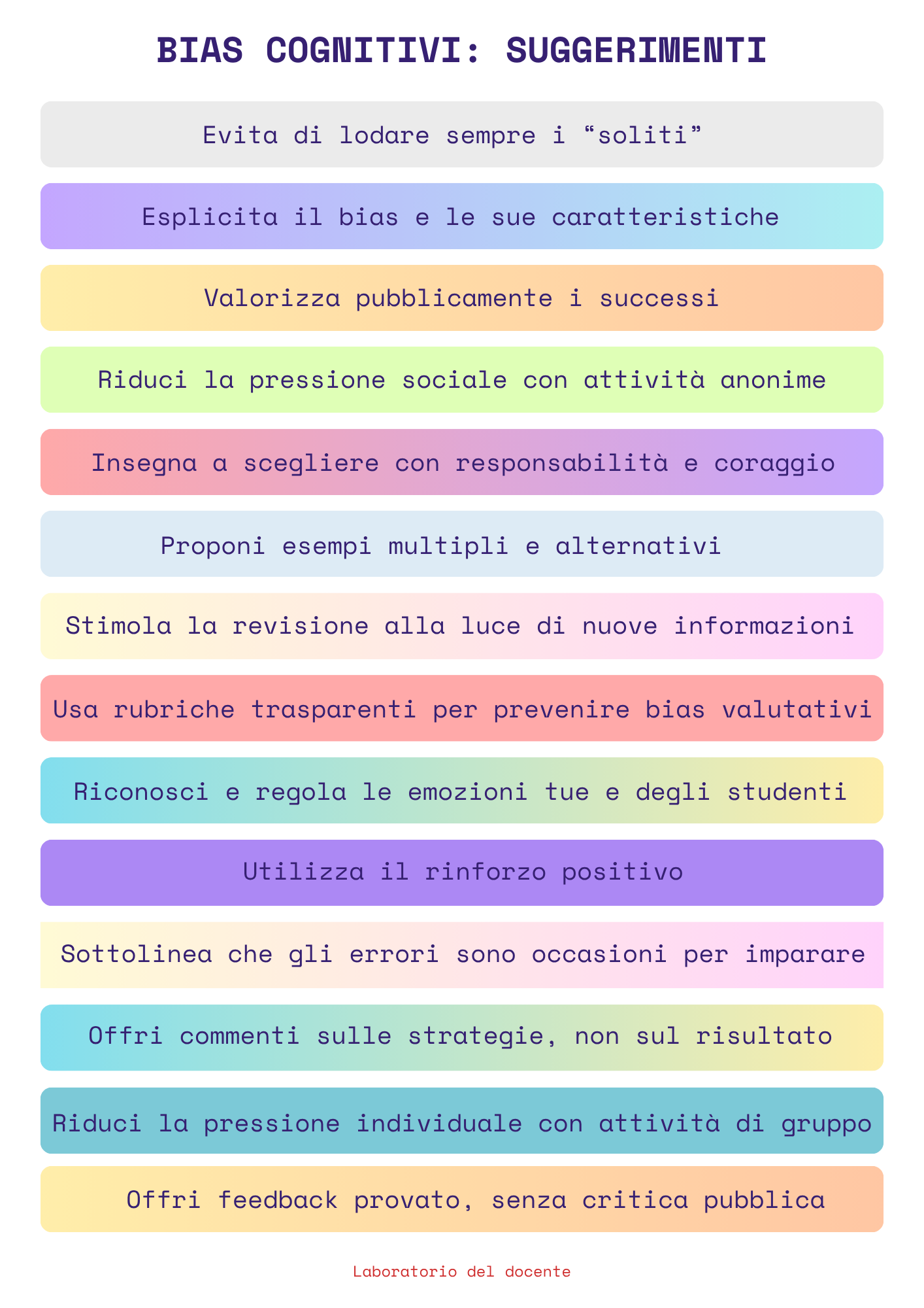- Bias dell’effetto dell’ancoraggio (Anchoring effect): gli studenti potrebbero basarsi in modo eccessivo sulla prima informazione ricevuta, come un voto iniziale, un giudizio, una proposta fatta da un compagno, una soluzione suggerita dal docente anche se non è del tutto rilevante. Di conseguenza, potrebbero non considerare alternative valide, mantenere convinzioni errate o sottovalutare i propri miglioramenti.