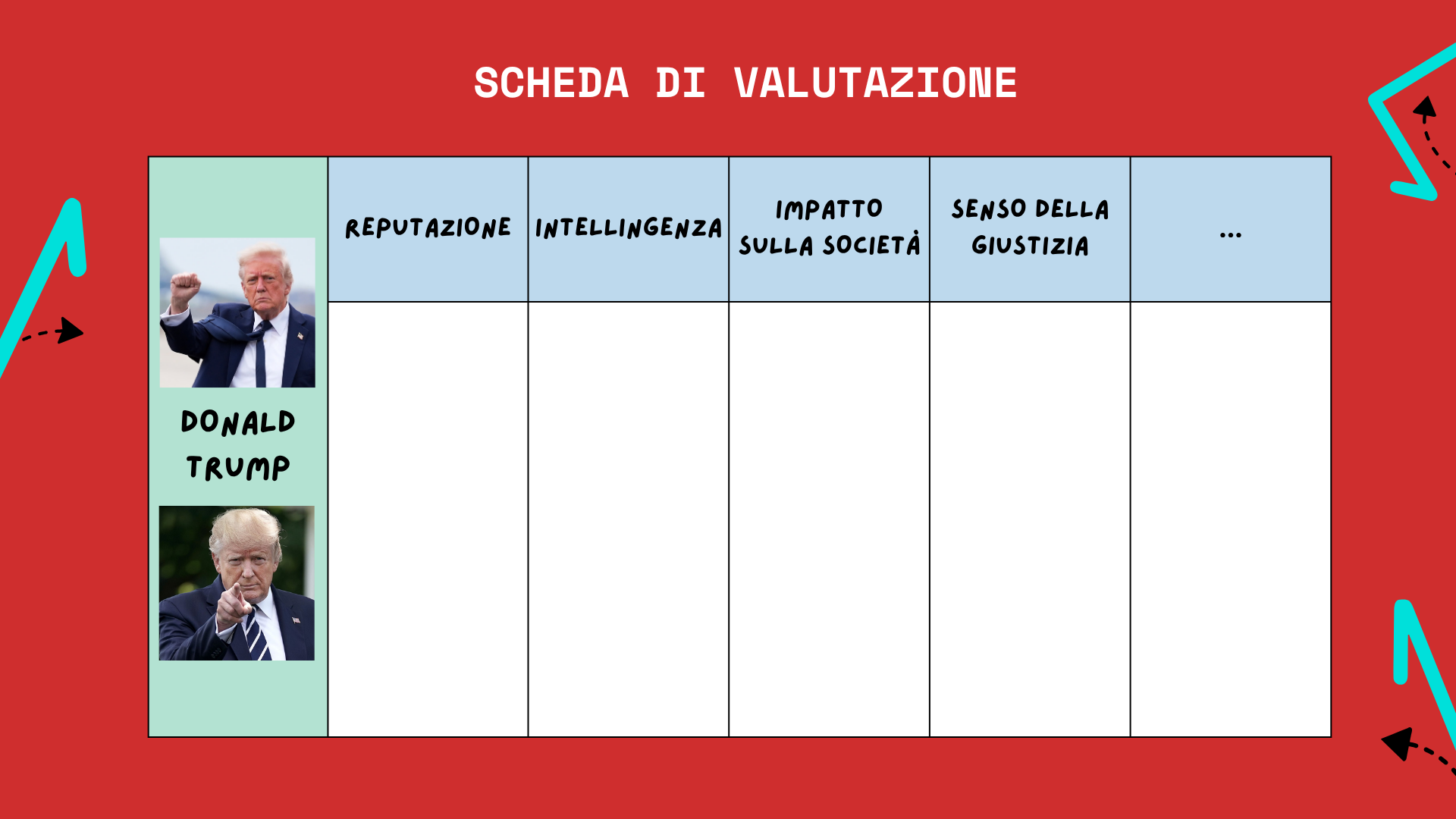 - Gli studenti danno un punteggio (1-5) a personaggi su criteri come coraggio, intelligenza strategica, impatto sulla società, giustizia.