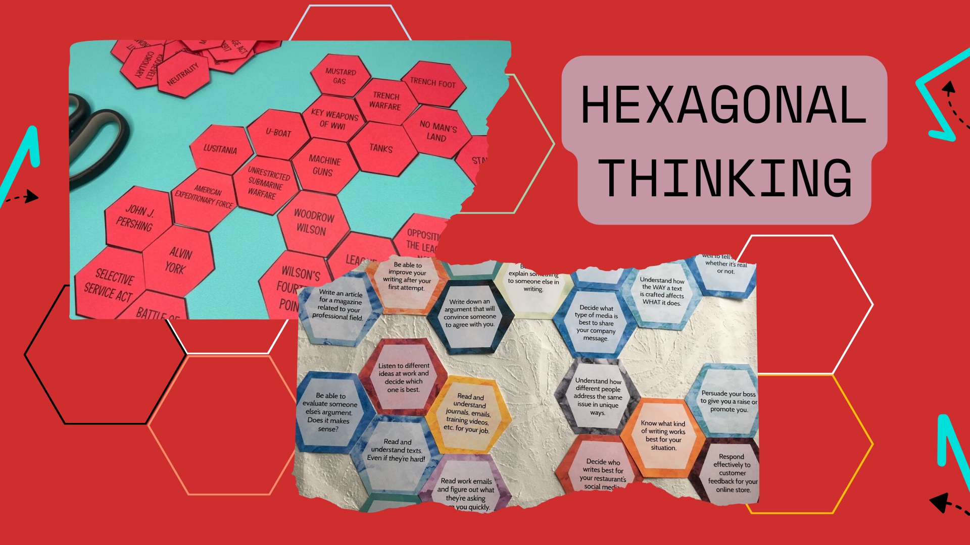 L’hexagonal thinking è una strategia di apprendimento visivo e cooperativo in cui gli studenti usano tessere esagonali, ognuna con un concetto o termine legato a una lezione. L’obiettivo non è definire le parole, ma trovare connessioni significative tra di esse, discutendone il perché. Quando due esagoni si toccano, dev’esserci una giustificazione concettuale.