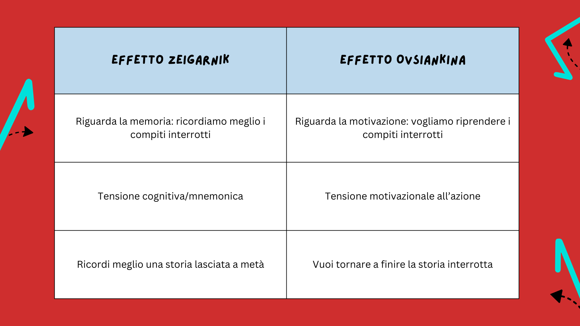 Quando iniziamo un’attività, il nostro cervello crea una tensione mentale legata al completamento. Se l’attività resta incompleta o interrotta, quella tensione persiste, mantenendo attiva l’informazione nella memoria. - L’Effetto Ovsiankina è un fenomeno psicologico secondo cui, quando un’attività viene interrotta prima del suo completamento, le persone tendono a volerla riprendere e portare a termine. In altre parole, quando interrompi un compito non finito, nasce in te una spinta interna a completarlo.